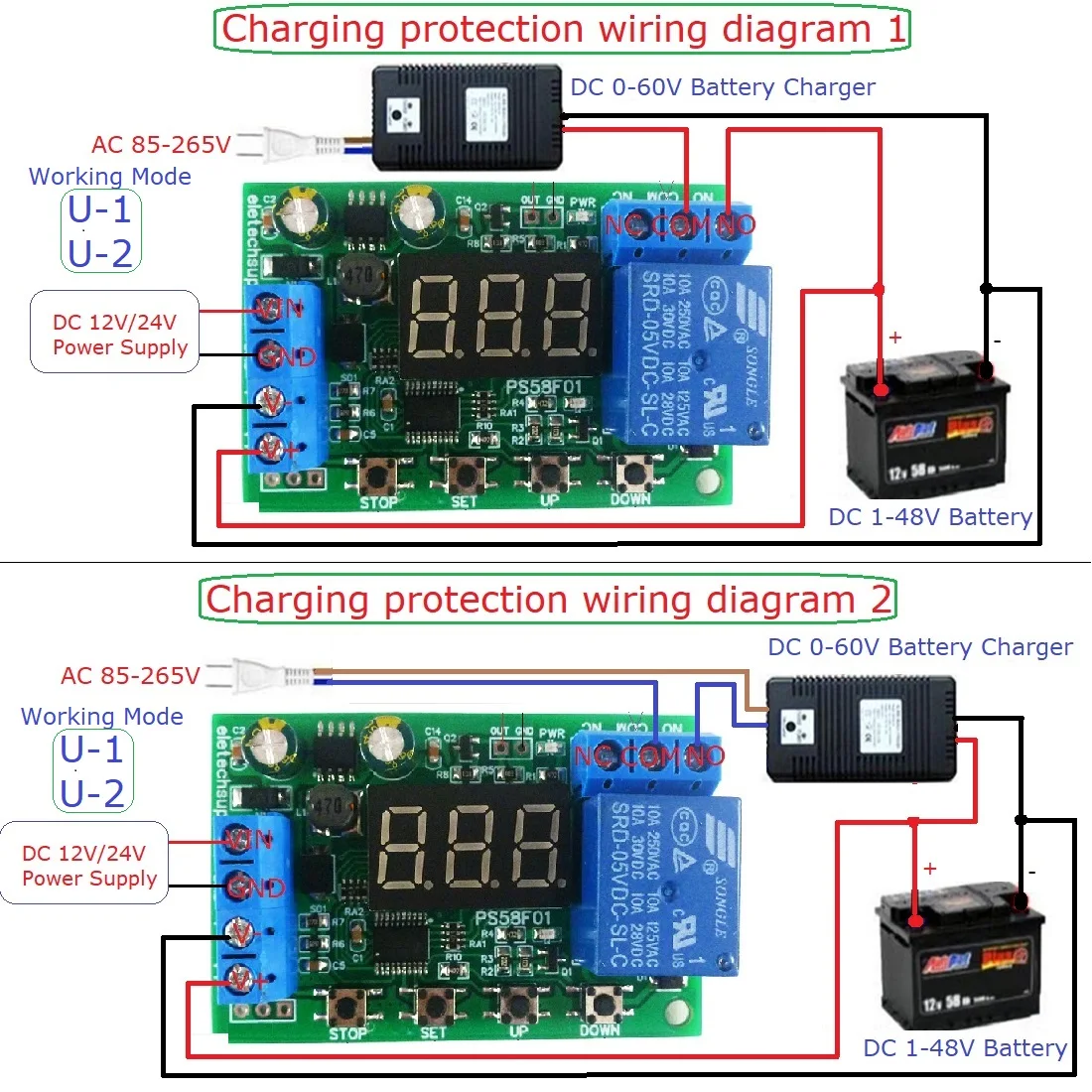 U-1: Charging: When the measured voltage is lower than the lower limit voltage, the relay is turned on, and when it is higher than the upper limit voltage, the relay is turned off;