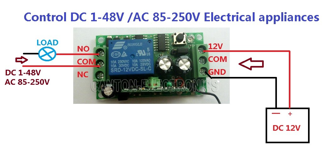 DC 1-48V OR AC 85-265V control circuit,Wiring diagram below(Note:If not DC 12V load, need another DC 12V power supply). "LOAD" may be LED lights, fans, motors and other DC AC equipment