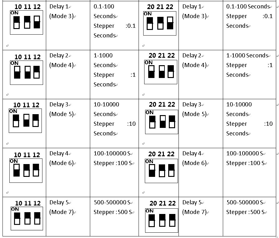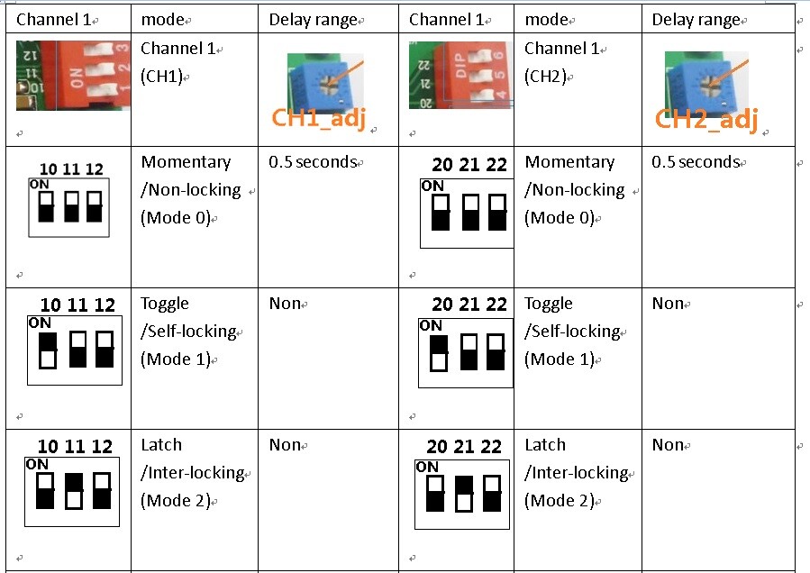 Work mode : Non-locking (Momentary is defult),Self-locking (Toggle),Inter-locking (Latch), Delay;Each channel independently set the Work mode; 500,000 seconds maximum delay