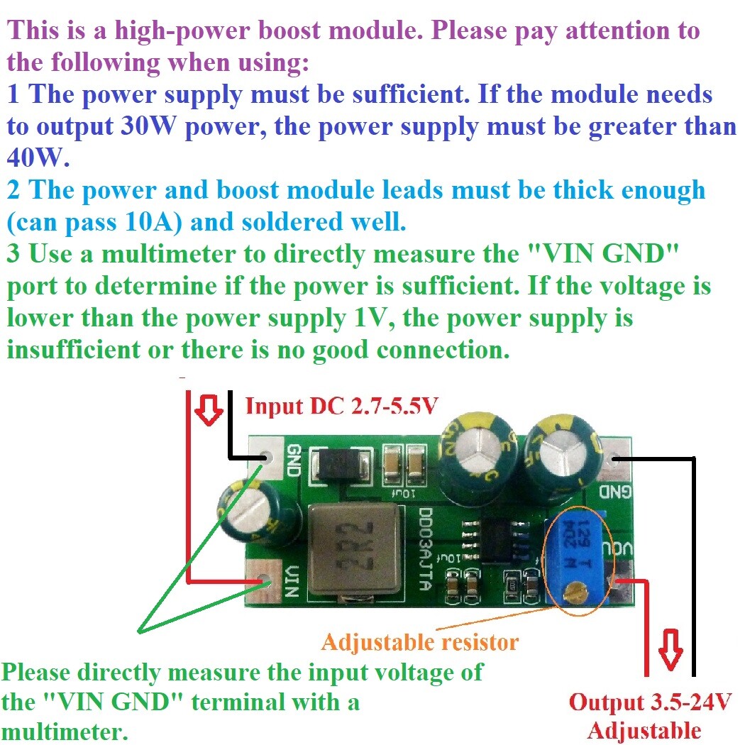 This is a high-power boost module. Please pay attention to the following when using: 1 The power supply must be sufficient. If the module needs to output 30W power, the power supply must be greater than 40W. 2 The power and boost module leads must be thick enough (can pass 10A) and soldered well. 3 Use a multimeter to directly measure the ''VIN GND'' port to determine if the power is sufficient. If the voltage is lower than the power supply 1V, the power supply is insufficient or there is no good connection. 4 Input voltage can not be greater than the maximum input range