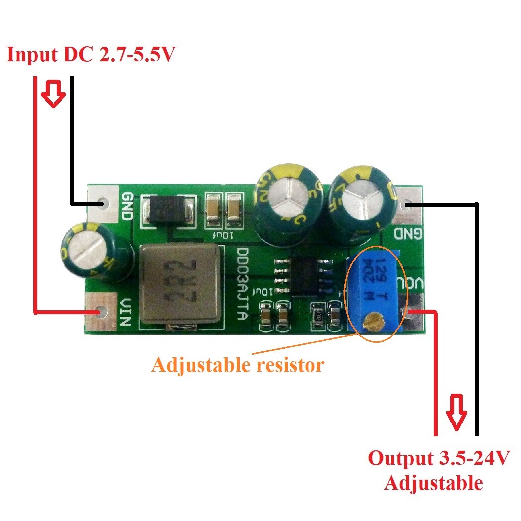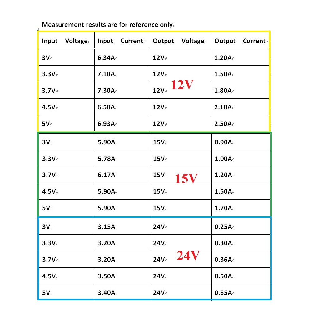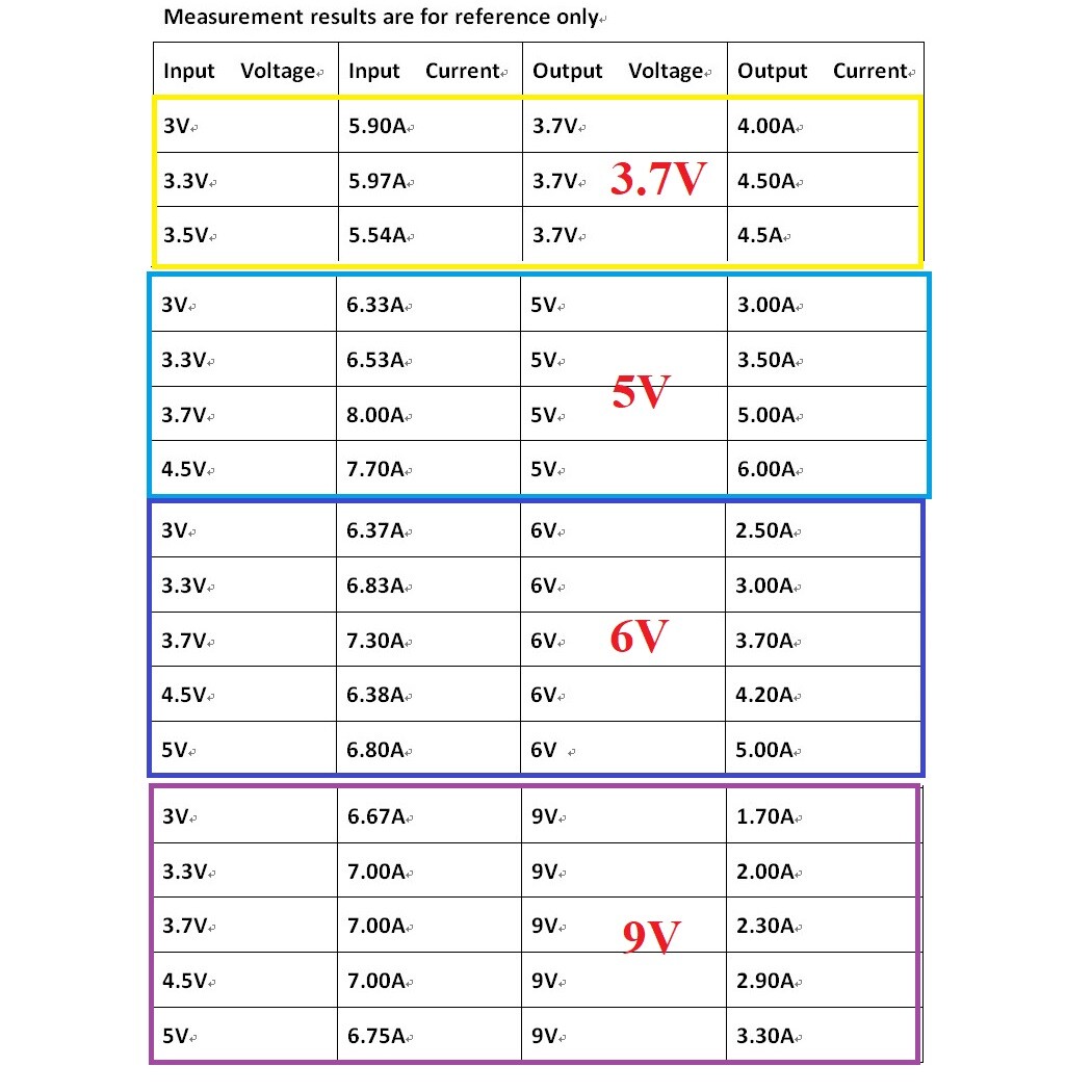 Input DC 2.7-5.5V,Adjustable Output DC 3.5-24V Maximum output power 30W(See the table for details) Maximum input current: 8A(See the table for details) Maximum output current: 6A(See the table for details) Quiescent current: about 1MA Efficiency : >=96% Switching Frequency : 600KHz fixed Overtemperature shutdown, input under-voltage protection and short circuit protection. UVLO Low Threshold 2.6V,UVLO High Threshold 3.2V,suitable for 3.7V lithium battery power supply Operating Ambient Temperature : -40 to 85 °C Storage Temperature : -55 to 150°C Size : 45*20*15mm Weight : 8g Attention :