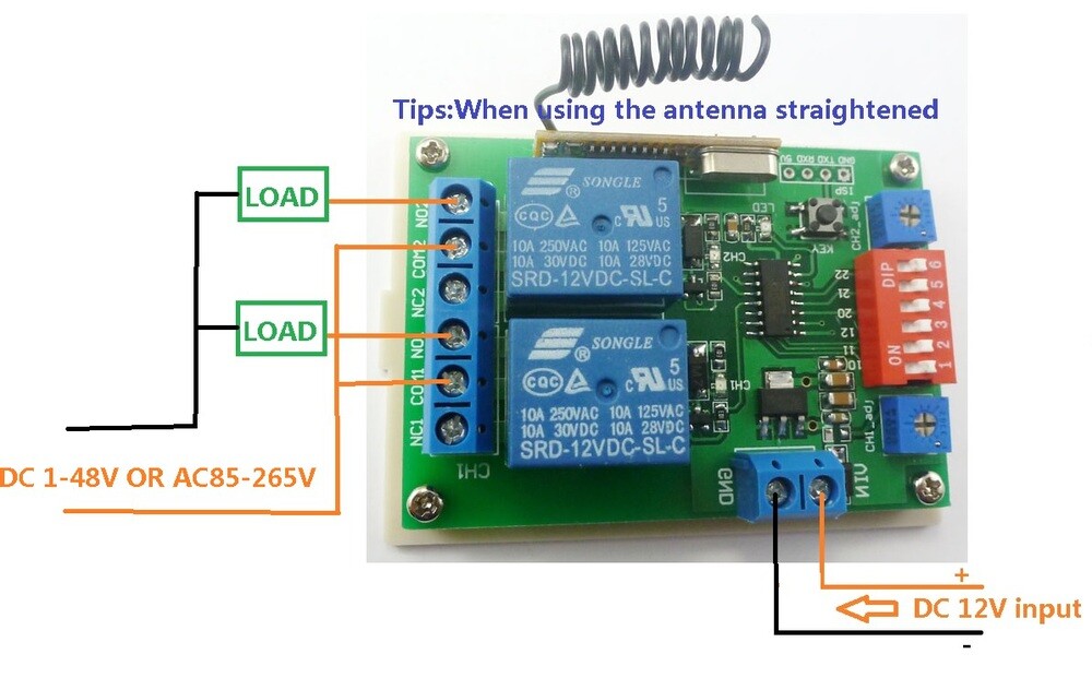 DC 1-48V OR AC 85-265V control circuit,Wiring diagram below(Note:If not DC 5V load, need another DC 5V power supply). "LOAD" may be LED lights, fans, motors and other DC AC equipment