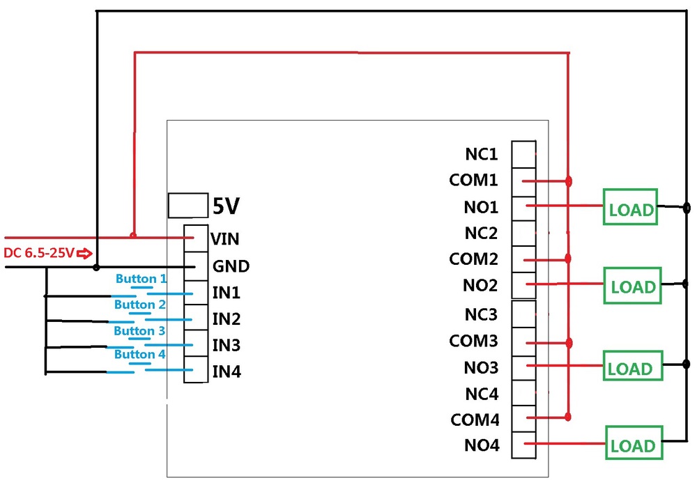2 DC 5V control circuit,Wiring diagram below. "LOAD" may be LED lights, fans, toy car and