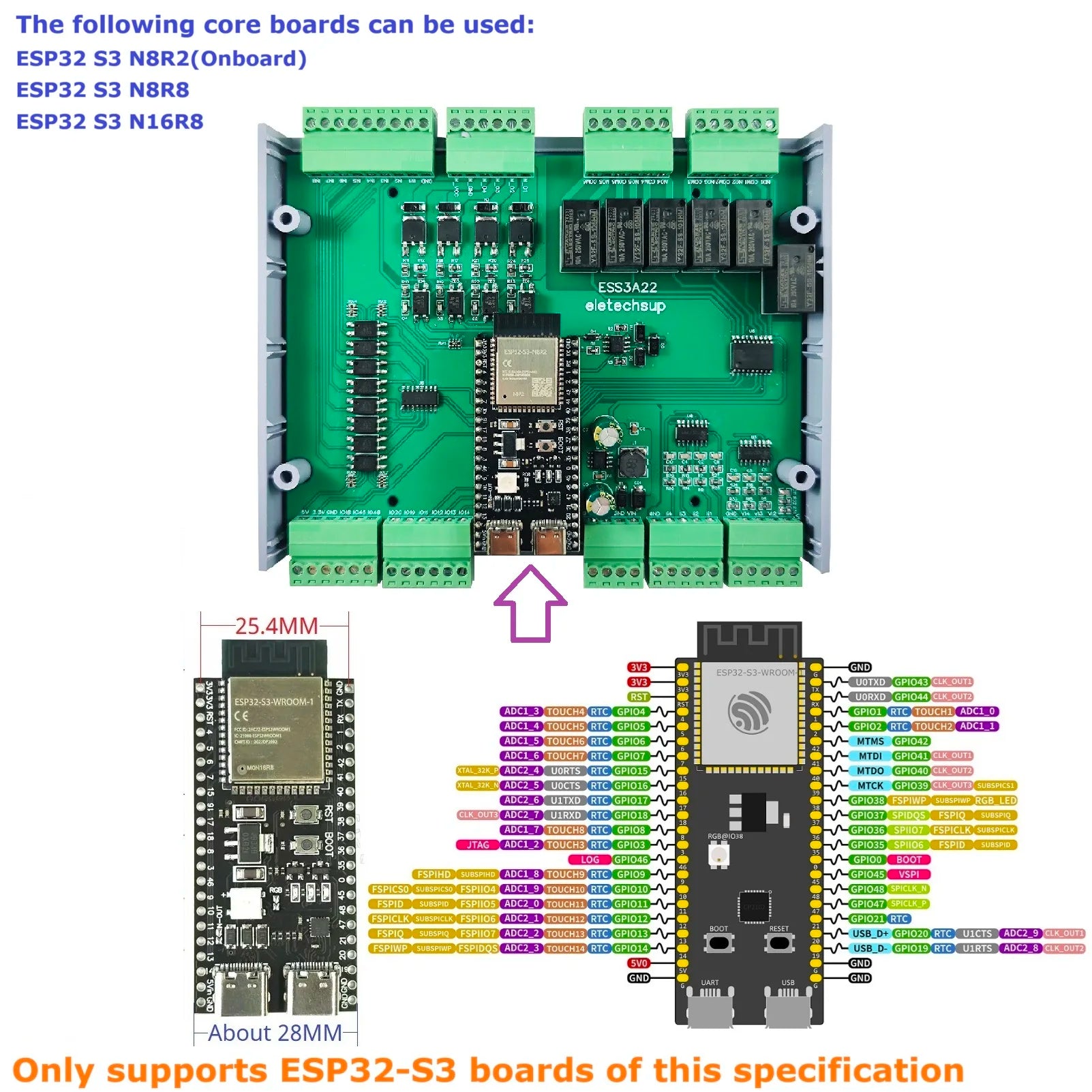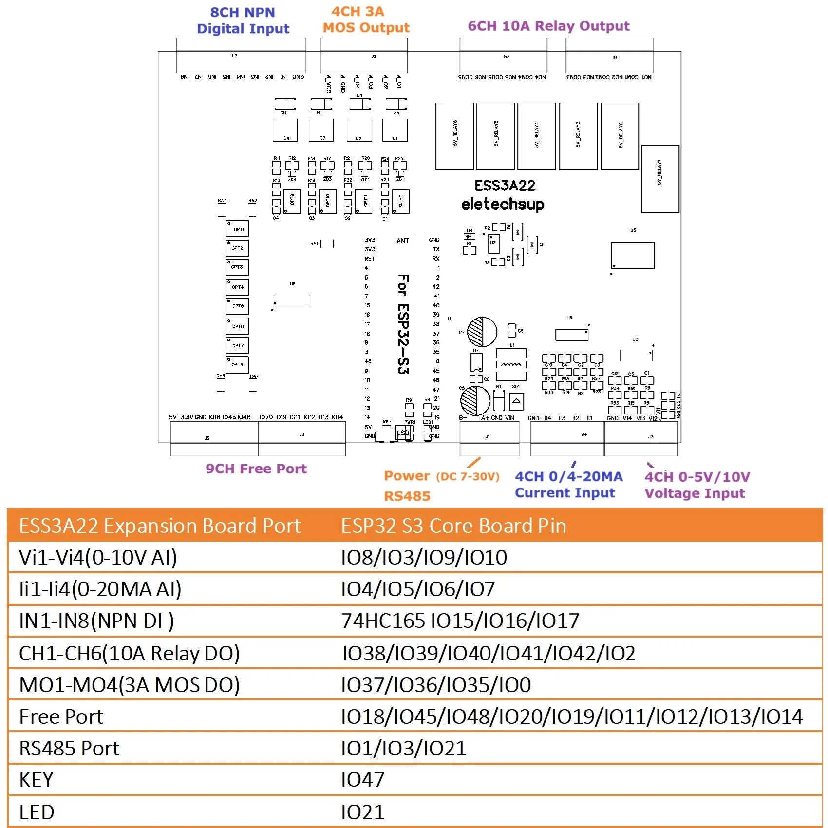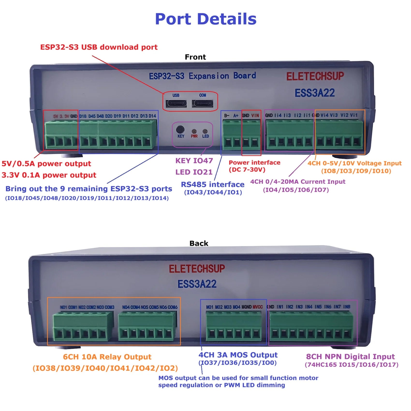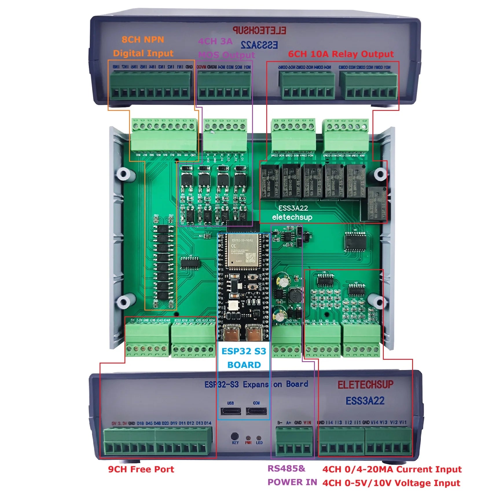 ESS3A22 is a multifunctional ESP32-S3 expansion box designed and produced by ELETECHSUP. It uses the powerful ESP32-S3 as the main control, has abundant digital and analog expansion ports, and leads to redundant IO ports. It is a good smart home control box.