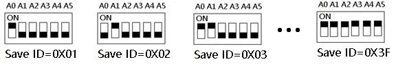 Slave address:A0-A5 are slave addresses, and 64 different slave addresses can be selected. In the MODBUS command mode, the slave address of the MODBUS command must be the same as the dial code of A0-A5 to communicate.