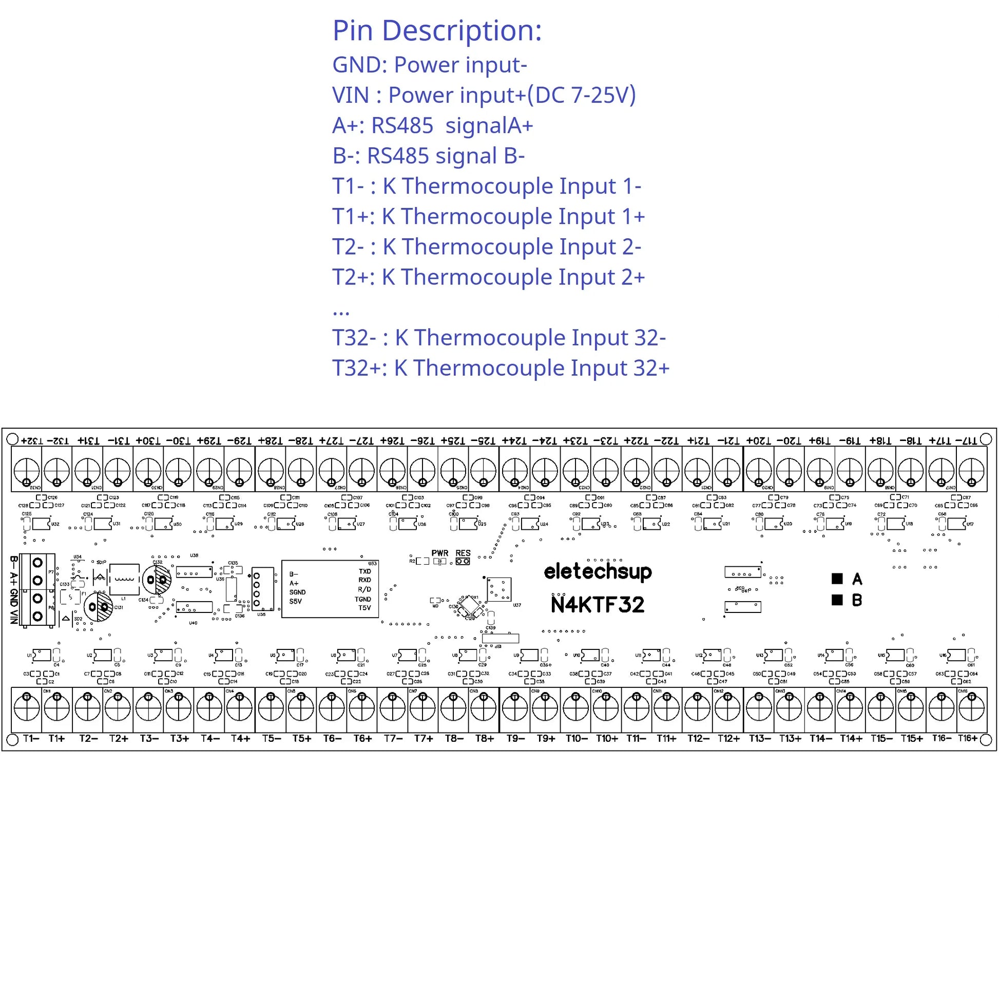 N4KTF32 is the 32CH RS485 K-type thermocouple collector developed and produced for the first time by eletechsup. Through this module, the temperature value of the K thermocouple can be converted into a digital quantity and transmitted through RS485. If the accuracy requirements are not high, you can use version A. If the accuracy requirements are high, it is recommended to use version B.