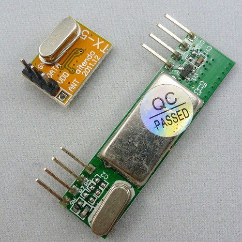 Transmitter and receiver modules are tuned to work correctly at 433.92MHz. Transmitter can be powered from 1.8-3.6V power supply while receiver accepts 5V. 5V is common for AVR microcontrollers so no problems with interfacing. Modules don't require addition components – just apply power and connect single data line to send information to/from and that's it. For better distances apply 30 – 35cm antennas. Modules use Amplitude-Shift Keying(ASK) modulation method and uses 1MHz bandwidth.