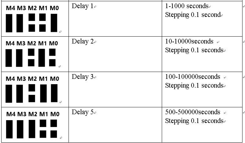 You can select different modes of operation with"M4 M3 M2 M1 M0" pad in the delay mode to adjust the delay time through an adjustable resistor.