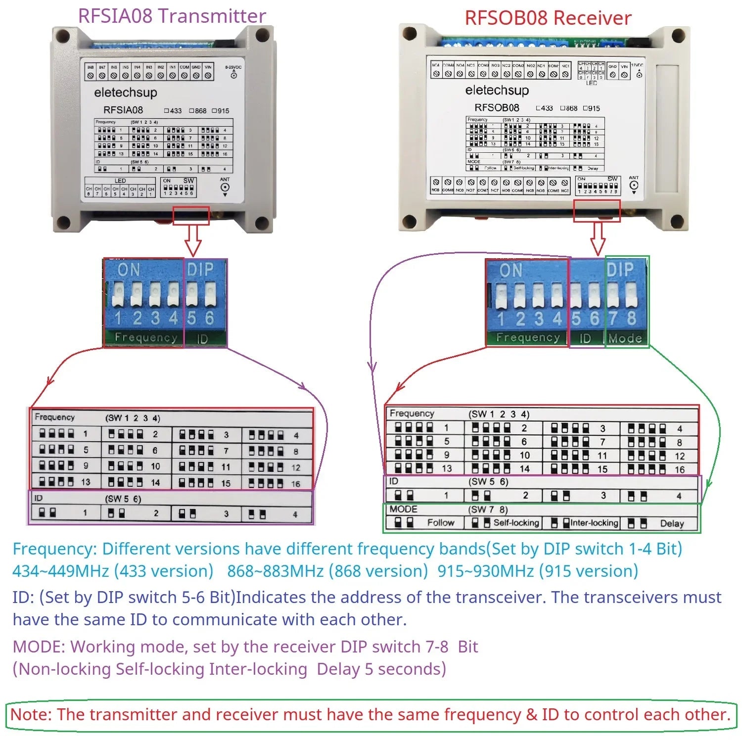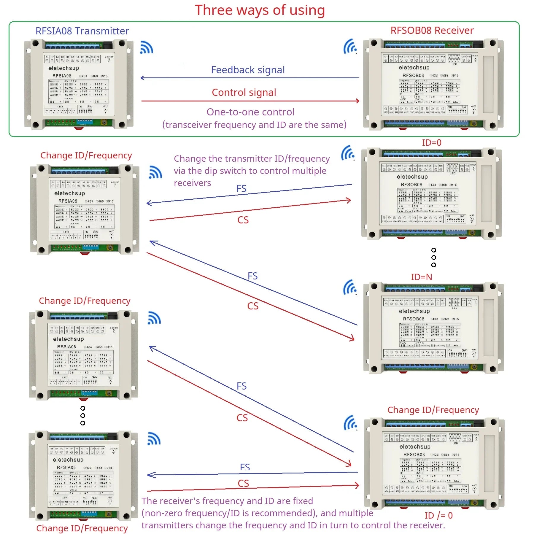 RFSIA08 RFSOB08 is a wireless remote control switch with feedback function, no configuration required, as long as the transceiver ''Frequency and ID'' settings are consistent, it can be controlled. With feedback function, the LED indicator on the transmitter will indicate the switch status of the receiver.