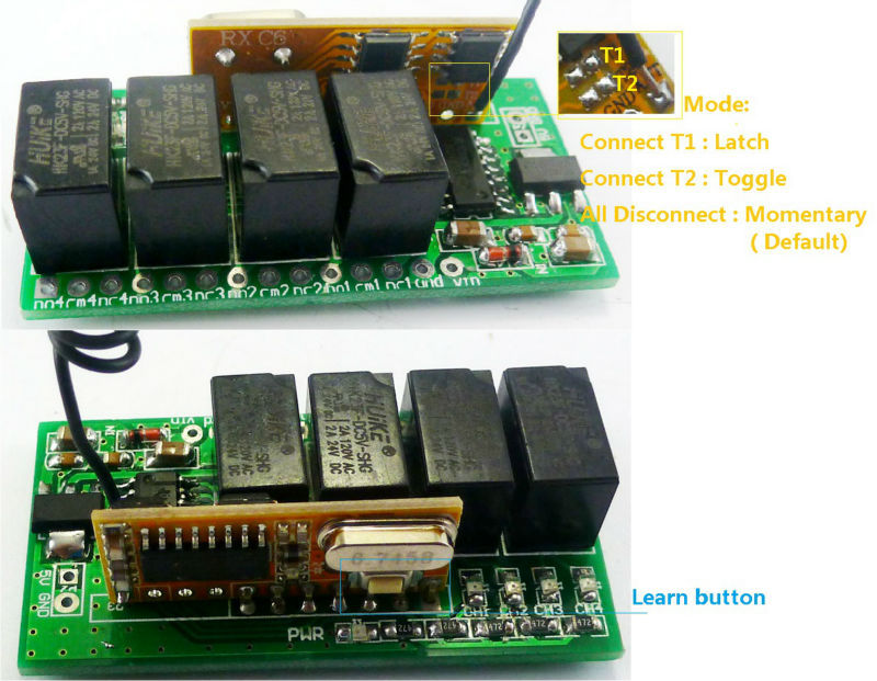 Latch : Press transmitter button A, the receiver Channel 1 is Open, the Channel 2/3/4 is Close.Press transmitter button B, the receiver Channel 2 is Open, the Channel 1/3/4 is Close.
